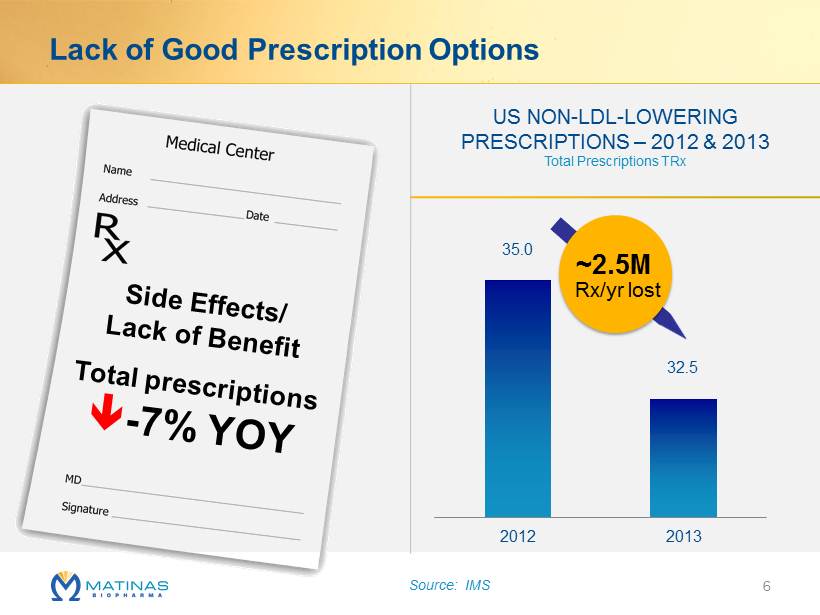 2012 2013 Lack of Good Prescription Options 6 ~2.5M Rx/ yr lost US NON - LDL - LOWERING PRESCRIPTIONS – 2012 & 2013 Total Prescriptions TRx Source: IMS 35.0 32.5