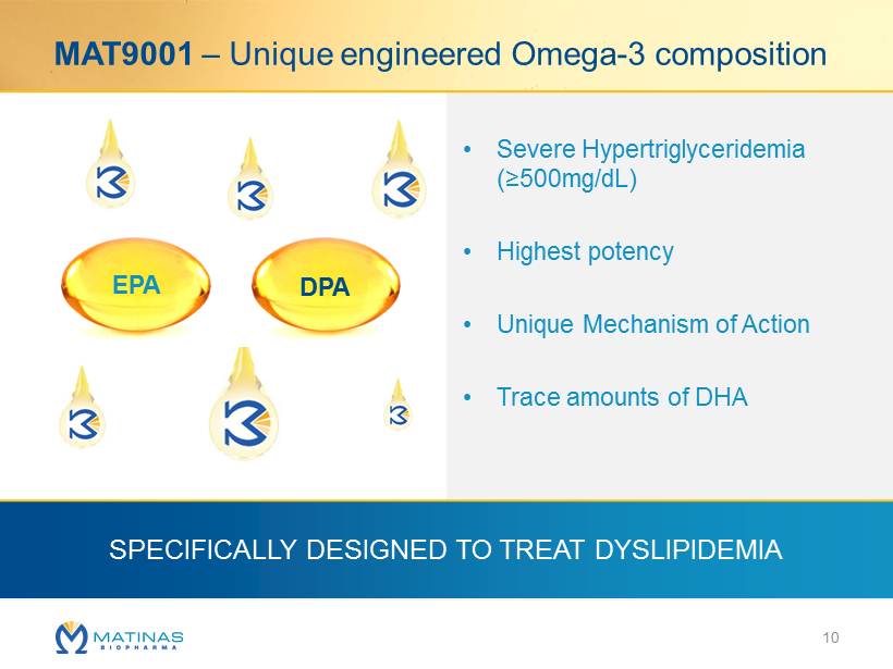 MAT9001 – Unique engineered Omega - 3 composition • Severe Hypertriglyceridemia (≥500mg/dL) • Highest potency • Unique Mechanism of Action • Trace amounts of DHA 10 EPA SPECIFICALLY DESIGNED TO TREAT DYSLIPIDEMIA DPA