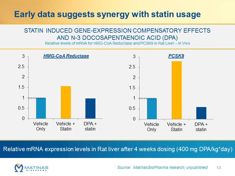 Quality by Design Our targeted development activities and related clinical investigations may yield a stronger therapeutic profile compared to the currently - existing therapies. 11 FASTING TG REDUCTION IN “FATTY ZUCKER” RAT MODEL Triglyceride Percent Reduction From Baseline – In Vivo -60% -50% -40% -30% -20% -10% 0% 50 200 400 1000 EPA 200 mg/kg EPA 400 mg/kg EPA 1000 mg/kg DPA 50 mg/kg Percent reduction from baseline in “Fatty Zucker ” rats after one week of dosing ( n =8 per treatment group). Source: Matinas BioPharma research; unpublished