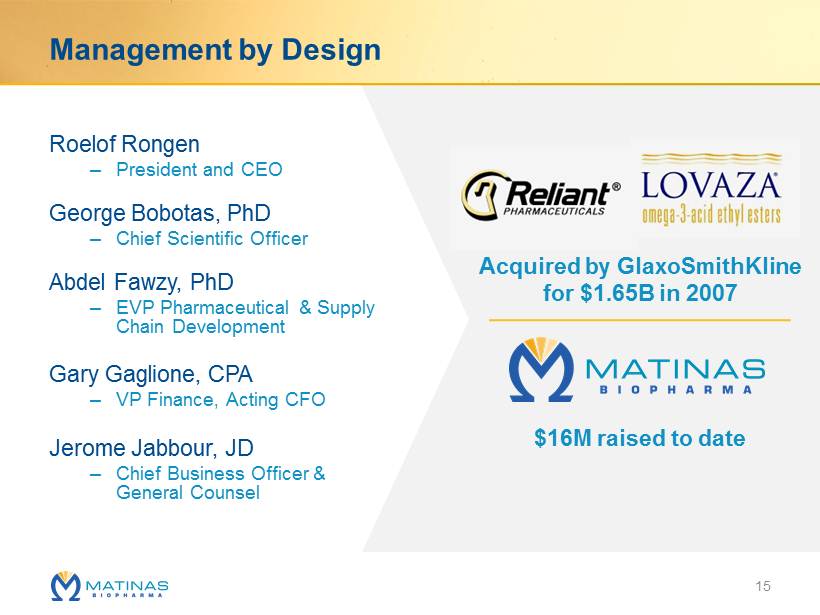 Management by Design Roelof Rongen – President and CEO George Bobotas , PhD – Chief Scientific Officer Abdel Fawzy , PhD – EVP Pharmaceutical & Supply Chain Development Gary Gaglione , CPA – VP Finance, Acting CFO Jerome Jabbour , JD – Chief Business Officer & General Counsel Acquired by GlaxoSmithKline for $1.65B in 2007 15 $16M raised to date