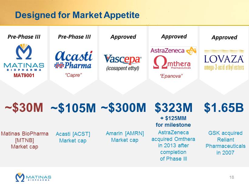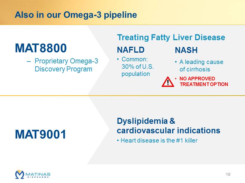 Designed for Market Appetite $1.65B GSK acquired Reliant Pharmaceuticals in 2007 ~$105M Acasti [ACST] Market cap $323M + $125MM for milestone AstraZeneca acquired Omthera in 2013 after completion of Phase III 18 ~$300M Amarin [AMRN] Market cap Approved Pre - Phase III “ Capre ” Approved Approved “ Epanova ” Pre - Phase III MAT9001 ~$30M Matinas BioPharma [MTNB] Market cap