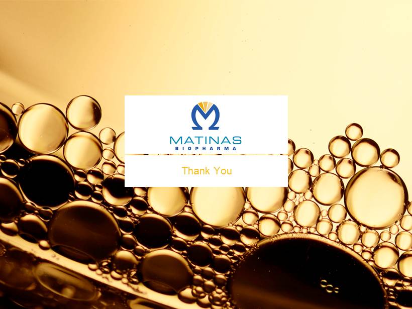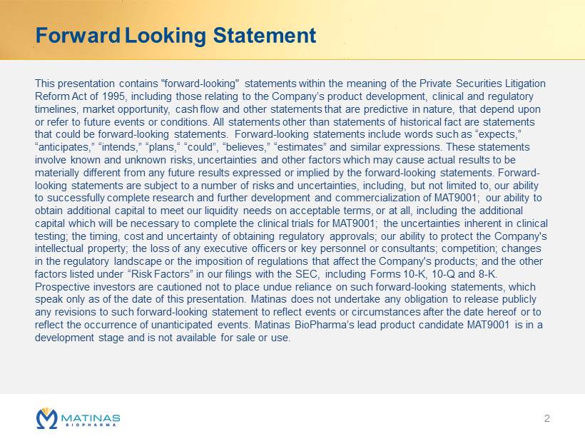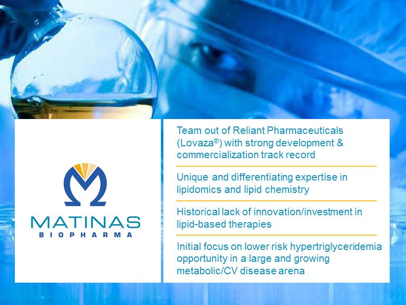 Forward Looking Statement This presentation contains "forward - looking" statements within the meaning of the Private Securities Litigation Reform Act of 1995, including those relating to the Company’s product development, clinical and regulatory timelines, market opportunity, cash flow and other statements that are predictive in nature, that depend upon or refer to future events or conditions. All statements other than statements of historical fact are statements that could be forward - looking statements. Forward - looking statements include words such as “expects,” “anticipates,” “intends,” “plans,“ “could”, “believes,” “estimates” and similar expressions. These statements involve known and unknown risks, uncertainties and other factors which may cause actual results to be materially different from any future results expressed or implied by the forward - looking statements. Forward - looking statements are subject to a number of risks and uncertainties, including, but not limited to, our ability to successfully complete research and further development and commercialization of MAT9001; our ability to obtain additional capital to meet our liquidity needs on acceptable terms, or at all, including the additional capital which will be necessary to complete the clinical trials for MAT9001; the uncertainties inherent in clinical testing; the timing, cost and uncertainty of obtaining regulatory approvals; our ability to protect the Company's intellectual property; the loss of any executive officers or key personnel or consultants; competition; changes in the regulatory landscape or the imposition of regulations that affect the Company's products; and the other factors listed under “Risk Factors” in our filings with the SEC, including Forms 10 - K, 10 - Q and 8 - K. Prospective investors are cautioned not to place undue reliance on such forward - looking statements, which speak only as of the date of this presentation. Matinas does not undertake any obligation to release publicly any revisions to such forward - looking statement to reflect events or circumstances after the date hereof or to reflect the occurrence of unanticipated events. Matinas BioPharma’s lead product candidate MAT9001 is in a development stage and is not available for sale or use. 2