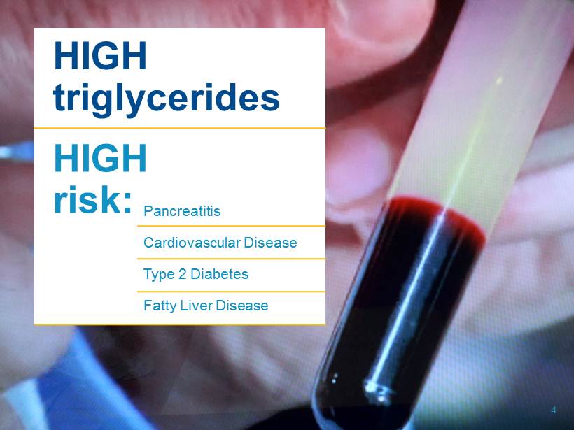 HIGH triglycerides Pancreatitis Cardiovascular Disease Type 2 Diabetes Fatty Liver Disease HIGH risk: 4