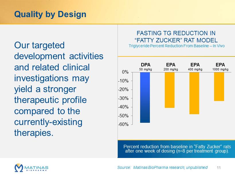 MAT9001 – Unique engineered Omega - 3 composition • Severe Hypertriglyceridemia (≥500mg/dL) • Highest potency • Unique Mechanism of Action • Trace amounts of DHA 10 EPA SPECIFICALLY DESIGNED TO TREAT DYSLIPIDEMIA DPA