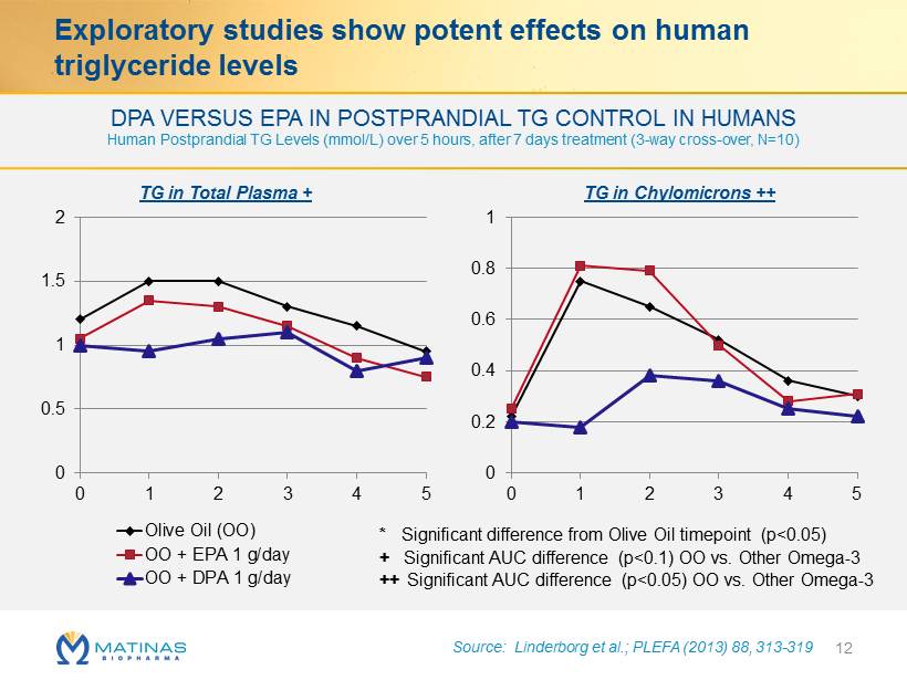 Quality by Design Our targeted development activities and related clinical investigations may yield a stronger therapeutic profile compared to the currently - existing therapies. 11 FASTING TG REDUCTION IN “FATTY ZUCKER” RAT MODEL Triglyceride Percent Reduction From Baseline – In Vivo -60% -50% -40% -30% -20% -10% 0% 50 200 400 1000 EPA 200 mg/kg EPA 400 mg/kg EPA 1000 mg/kg DPA 50 mg/kg Percent reduction from baseline in “Fatty Zucker ” rats after one week of dosing ( n =8 per treatment group). Source: Matinas BioPharma research; unpublished