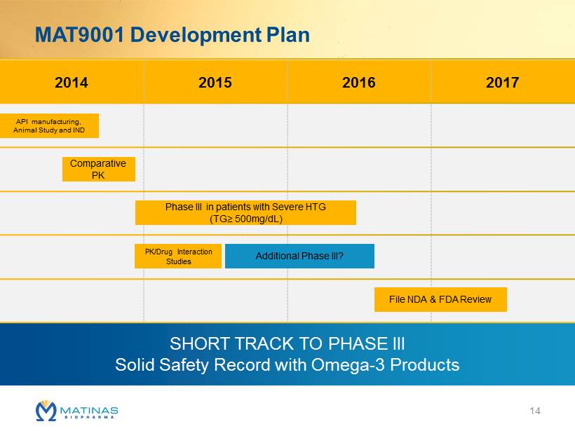 Early data suggests synergy with statin usage 13 STATIN INDUCED GENE - EXPRESSION COMPENSATORY EFFECTS AND N - 3 DOCOSAPENTAENOIC ACID (DPA) Relative levels of mRNA for HMG - CoA Reductase and PCSK9 in Rat Liver – In Vivo 0 0.5 1 1.5 2 2.5 3 Vehicle Only Vehicle + Statin DPA + statin 0 0.5 1 1.5 2 2.5 3 Vehicle Only Vehicle + Statin DPA + statin Relative mRNA expression levels in Rat liver after 4 weeks dosing (400 mg DPA/kg*day) Source: Matinas BioPharma research; unpublished PCSK9 HMG - CoA Reductase