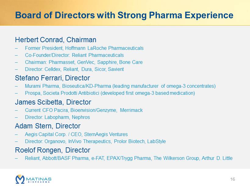 Board of Directors with Strong Pharma Experience Herbert Conrad, Chairman – Former President, Hoffmann LaRoche Pharmaceuticals – Co - Founder/Director: Reliant Pharmaceuticals – Chairman: Pharmasset , GenVec , Sapphire, Bone Care – Director: Celldex , Reliant, Dura, Sicor , Savient Stefano Ferrari, Director – Murami Pharma , Bioseutica/KD - Pharma (leading manufacturer of omega - 3 concentrates) – Prospa , Societa Prodotti Antibiotici (developed first omega - 3 based medication) James Scibetta , Director – Current CFO Pacira , Bioenvision/Genzyme , Merrimack – Director: Labopharm , Nephros Adam Stern, Director – Aegis Capital Corp. / CEO, SternAegis Ventures – Director: Organovo , InVivo Therapeutics, Prolor Biotech, LabStyle Roelof Rongen , Director – Reliant, Abbott/BASF Pharma , e - FAT, EPAX/ Trygg Pharma , The Wilkerson Group, Arthur D. Little 16