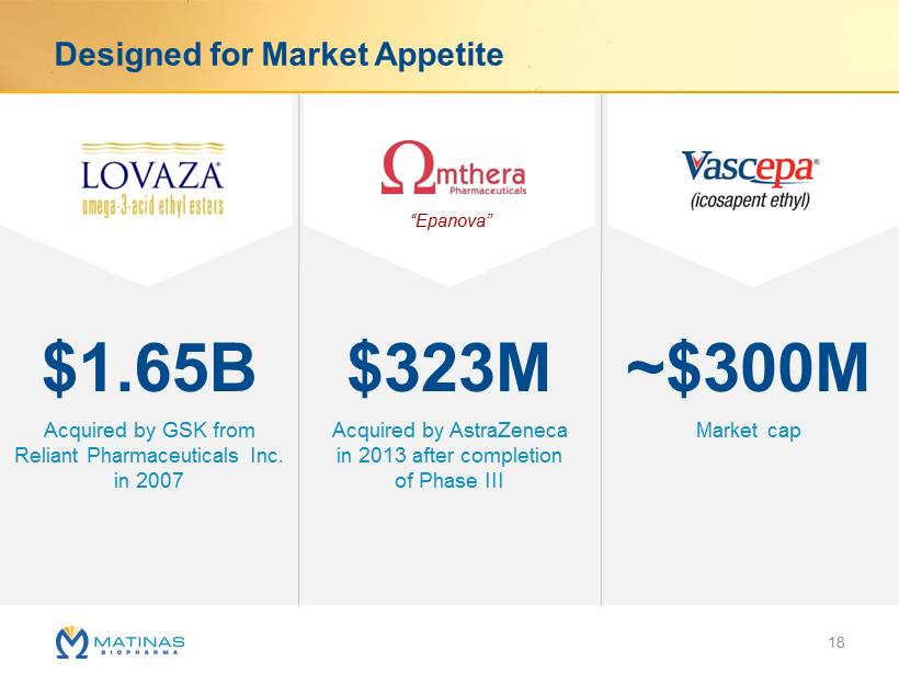 We See… ~4 million adults with severe hypertriglyceridemia ~$200/month Lovaza/Vascepa pricing AN ATTRACTIVE MARKET… AND ATTRACTIVE ECONOMICS WITH A CLEAR NEED… 17 Lack of Satisfactory Rx Options
