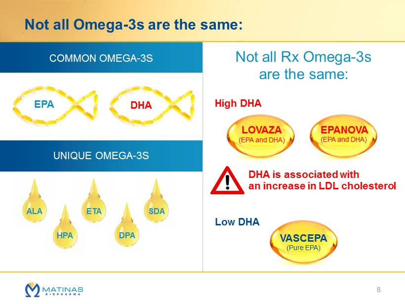Not all Omega - 3s are the same: Not all Rx Omega - 3s are the same: 8 COMMON OMEGA - 3S EPA DHA is associated with an increase in LDL cholesterol UNIQUE OMEGA - 3S DHA ALA ETA HPA LOVAZA (EPA and DHA) EPANOVA (EPA and DHA) VASCEPA (Pure EPA) High DHA Low DHA DPA SDA