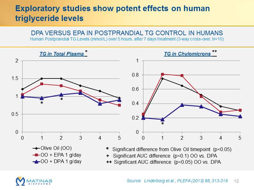 Quality by Design Our targeted development activities and related clinical investigations may yield a stronger therapeutic profile compared to the currently - existing therapies. 11 FASTING TG REDUCTION IN “FATTY ZUCKER” RAT MODEL Triglyceride Percent Reduction From Baseline – In Vivo -60% -50% -40% -30% -20% -10% 0% 50 200 400 1000 EPA 200 mg/kg EPA 400 mg/kg EPA 1000 mg/kg DPA 50 mg/kg Percent reduction from baseline in “Fatty Zucker ” rats after one week of dosing ( n =8 per treatment group). Source: Matinas BioPharma research; unpublished
