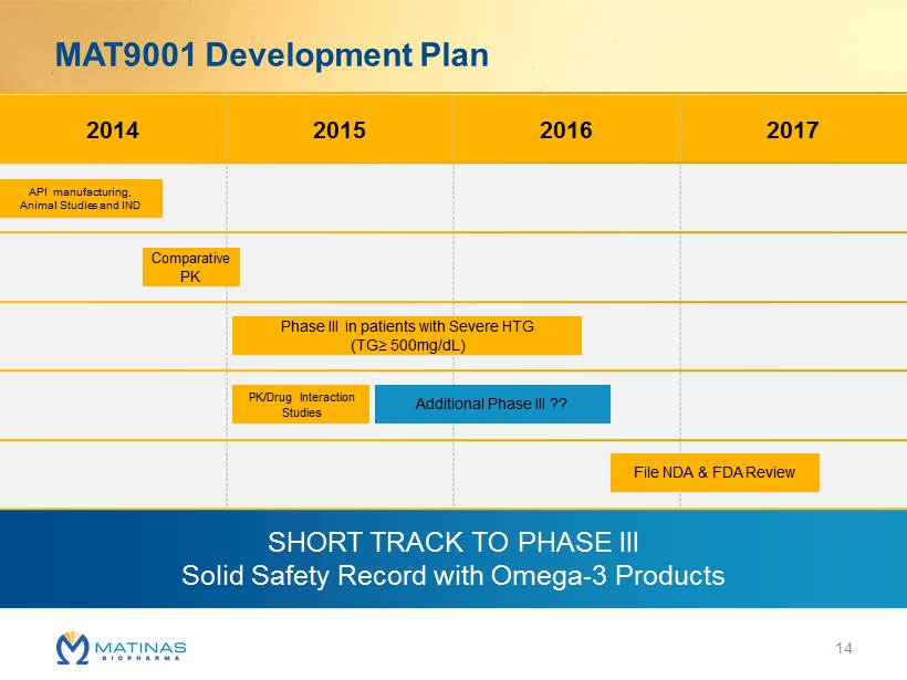 Early data suggests synergy with statin usage 13 STATIN INDUCED GENE - EXPRESSION COMPENSATORY EFFECTS AND N - 3 DOCOSAPENTAENOIC ACID (DPA) Relative levels of mRNA for HMG - CoA Reductase and PCSK9 in Rat Liver – In Vivo 0 0.5 1 1.5 2 2.5 3 Vehicle Only Vehicle + Statin DPA + statin 0 0.5 1 1.5 2 2.5 3 Vehicle Only Vehicle + Statin DPA + statin Source: Matinas BioPharma research; unpublished PCSK9 HMG - CoA Reductase Relative mRNA expression levels in Rat liver after 4 weeks dosing (400 mg DPA/kg*day)