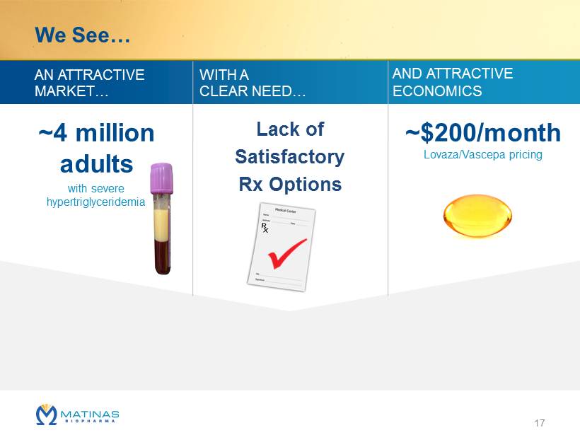 We See… ~4 million adults with severe hypertriglyceridemia ~$200/month Lovaza/Vascepa pricing AN ATTRACTIVE MARKET… AND ATTRACTIVE ECONOMICS WITH A CLEAR NEED… 17 Lack of Satisfactory Rx Options