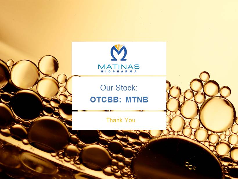 Forward Looking Statement This presentation contains "forward - looking" statements within the meaning of the Private Securities Litigation Reform Act of 1995, including those relating to the Company’s product development, clinical and regulatory timelines, market opportunity, cash flow and other statements that are predictive in nature, that depend upon or refer to future events or conditions. All statements other than statements of historical fact are statements that could be forward - looking statements. Forward - looking statements include words such as “expects,” “anticipates,” “intends,” “plans,“ “could”, “believes,” “estimates” and similar expressions. These statements involve known and unknown risks, uncertainties and other factors which may cause actual results to be materially different from any future results expressed or implied by the forward - looking statements. Forward - looking statements are subject to a number of risks and uncertainties, including, but not limited to, our ability to successfully complete research and further development and commercialization of MAT9001; our ability to obtain additional capital to meet our liquidity needs on acceptable terms, or at all, including the additional capital which will be necessary to complete the clinical trials for MAT9001; the uncertainties inherent in clinical testing; the timing, cost and uncertainty of obtaining regulatory approvals; our ability to protect the Company's intellectual property; the loss of any executive officers or key personnel or consultants; competition; changes in the regulatory landscape or the imposition of regulations that affect the Company's products; and the other factors listed under “Risk Factors” in our filings with the SEC, including Forms 10 - K, 10 - Q and 8 - K. Prospective investors are cautioned not to place undue reliance on such forward - looking statements, which speak only as of the date of this presentation. Matinas does not undertake any obligation to release publicly any revisions to such forward - looking statement to reflect events or circumstances after the date hereof or to reflect the occurrence of unanticipated events. Matinas BioPharma’s lead product candidate MAT9001 is in a development stage and is not available for sale or use. 2
