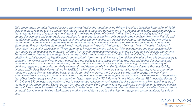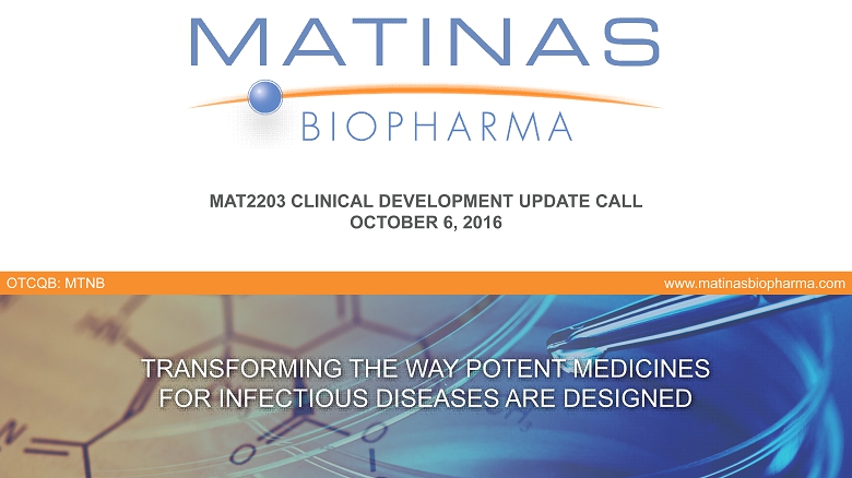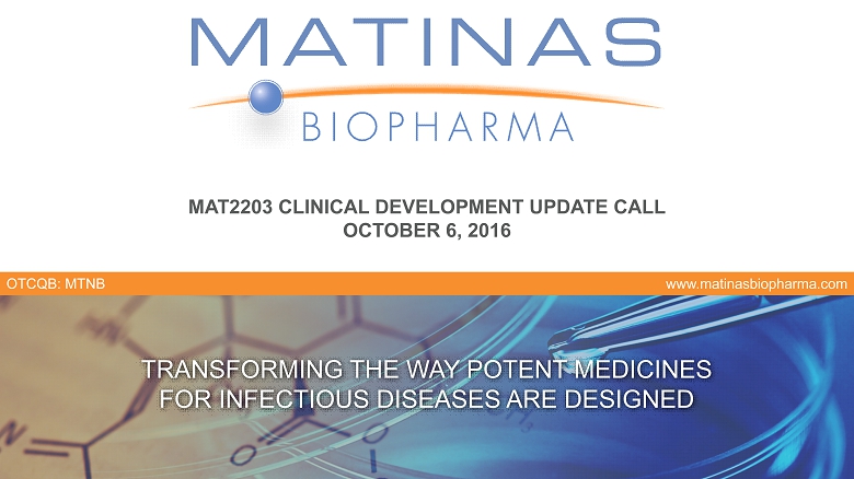 www.matinasbiopharma.com OTCQB: MTNB TRANSFORMING THE WAY POTENT MEDICINES FOR INFECTIOUS DISEASES ARE DESIGNED MAT2203 CLINICAL DEVELOPMENT UPDATE CALL OCTOBER 6, 2016