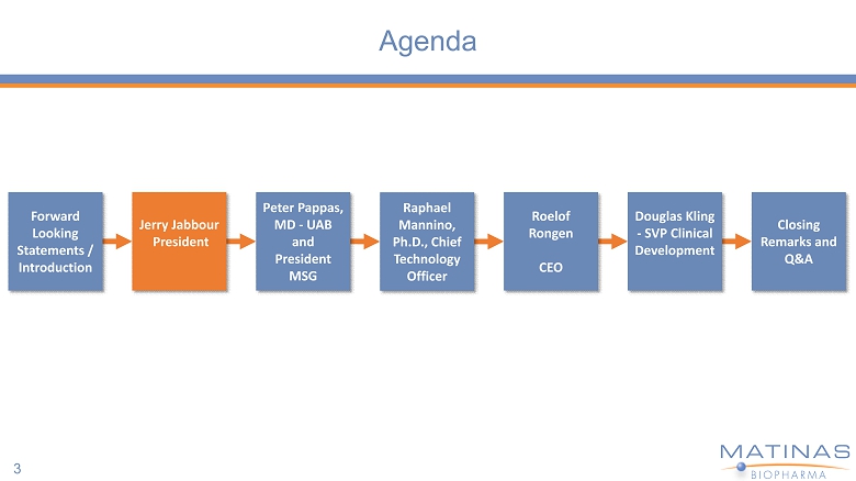 Forward Looking Statement This presentation contains "forward - looking statements" within the meaning of the Private Securities Litigation Reform Act of 19 95, including those relating to the Company's strategic focus and the future development of its product candidates, including MAT 220 3, the anticipated timing of regulatory submissions, the anticipated timing of clinical studies, the Company’s ability to identi fy and pursue development and partnership opportunities for its products or platform delivery technology on favorable terms, if at a ll, and the ability to obtain required regulatory approval and other statements that are predictive in nature, that depend upon or re fer to future events or conditions. All statements other than statements of historical fact are statements that could be forward - lookin g statements. Forward - looking statements include words such as "expects," "anticipates," "intends," "plans," "could," "believes," "estimates" and similar expressions. These statements involve known and unknown risks, uncertainties and other factors which may cause actual results to be materially different from any future results expressed or implied by the forward - looking statemen ts. Forward - looking statements are subject to a number of risks and uncertainties, including, but not limited to, our ability to obt ain additional capital to meet our liquidity needs on acceptable terms, or at all, including the additional capital which will be ne cessary to complete the clinical trials of our product candidates; our ability to successfully complete research and further development an d commercialization of our product candidates; the uncertainties inherent in clinical testing; the timing, cost and uncertainty of obtaining regulatory approvals; our ability to maintain and derive benefit from the Qualified Infectious Disease Product (QID P), Orphan and/or Fast Track designations for MAT2203, which does not change the standards for regulatory approval or guarantee regulatory approval on an expedited basis, or at all; our ability to protect the Company's intellectual property; the loss of an y executive officers or key personnel or consultants; competition; changes in the regulatory landscape or the imposition of reg ula tions that affect the Company's products; and the other factors listed under "Risk Factors" in our filings with the SEC, including For ms 10 - K, 10 - Q and 8 - K. Investors are cautioned not to place undue reliance on such forward - looking statements, which speak only as of the date of this presentation. Except as may be required by law, the Company does not undertake any obligation to release pub lic ly any revisions to such forward - looking statements to reflect events or circumstances after the date hereof or to reflect the occu rrence of unanticipated events. Matinas BioPharma's product candidates are all in a development stage and are not available for sale or use. 2