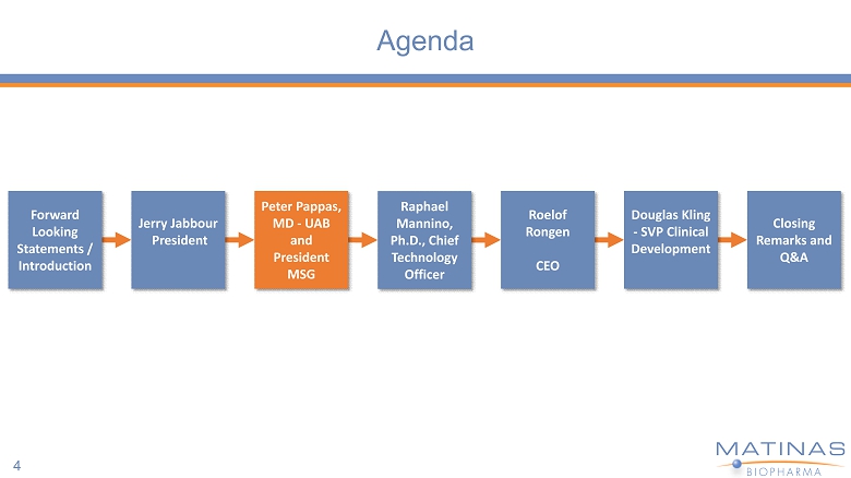 Agenda 3 Forward Looking Statements / Introduction Jerry Jabbour President Peter Pappas, MD - UAB and President MSG Raphael Mannino, Ph.D., Chief Technology Officer Roelof Rongen CEO Douglas Kling - SVP Clinical Development Closing Remarks and Q&A