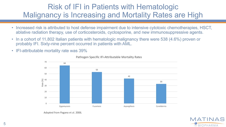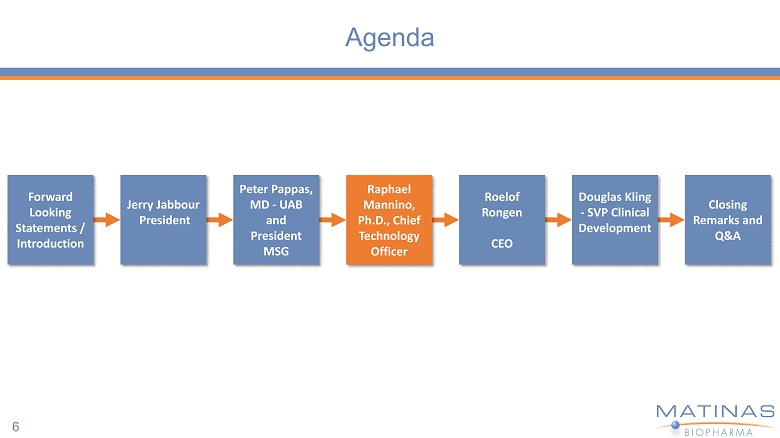 Agenda 4 Forward Looking Statements / Introduction Jerry Jabbour President Peter Pappas, MD - UAB and President MSG Raphael Mannino, Ph.D., Chief Technology Officer Roelof Rongen CEO Douglas Kling - SVP Clinical Development Closing Remarks and Q&A