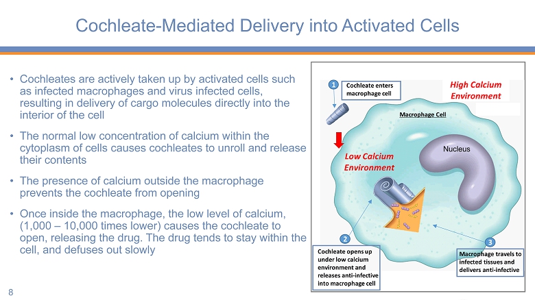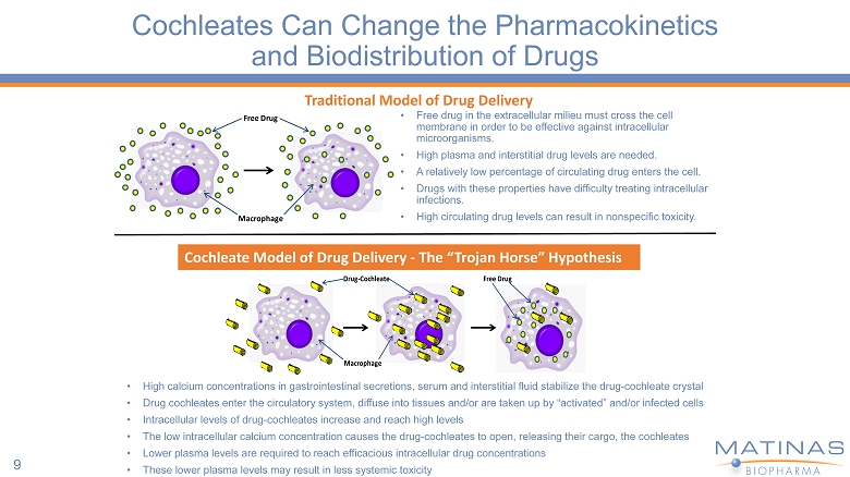 Cochleate - Mediated Delivery into Activated Cells • Cochleates are actively taken up by activated cells such as infected macrophages and virus infected cells, resulting in delivery of cargo molecules directly into the interior of the cell • The normal low concentration of calcium within the cytoplasm of cells causes cochleates to unroll and release their contents • The presence of calcium outside the macrophage prevents the cochleate from opening • Once inside the macrophage, the low level of calcium, (1,000 – 10,000 times lower) causes the cochleate to open, releasing the drug. The drug tends to stay within the cell, and defuses out slowly 8 Low Calcium Environment 1 2 Cochleate opens up under low calcium environment and releases anti - infective into macrophage cell 3 Macrophage travels to infected tissues and delivers anti - infective Macrophage Cell Cochleate enters macrophage cell High Calcium Environment