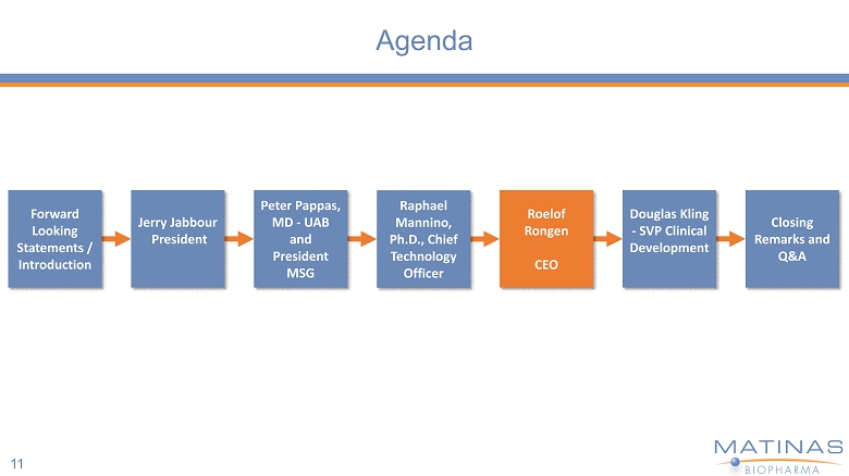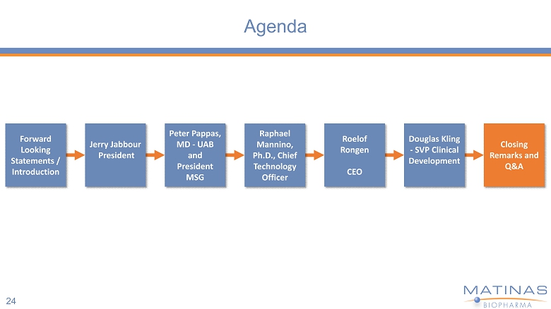Agenda 16 Forward Looking Statements / Introduction Jerry Jabbour President Peter Pappas, MD - UAB and President MSG Raphael Mannino, Ph.D., Chief Technology Officer Roelof Rongen CEO Douglas Kling SVP Clinical Development Closing Remarks and Q&A