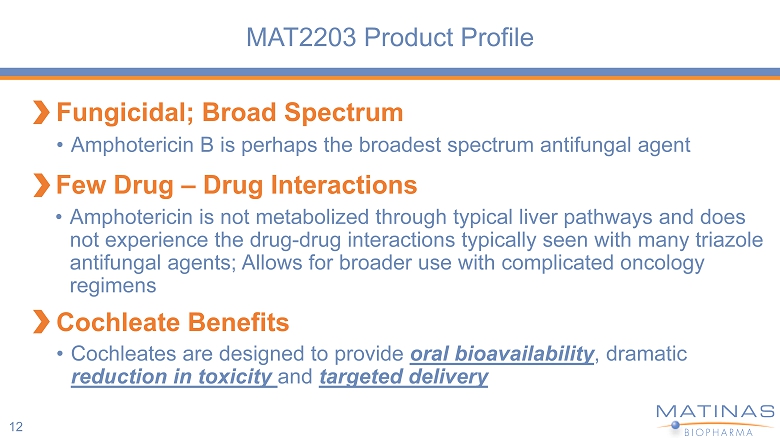 MAT2203 Product Profile 12 Fungicidal; Broad Spectrum Few Drug – Drug Interactions Cochleate Benefits • Amphotericin B is perhaps the broadest spectrum antifungal agent • Amphotericin is not metabolized through typical liver pathways and does not experience the drug - drug interactions typically seen with many triazole antifungal agents; Allows for broader use with complicated oncology regimens • Cochleates are designed to provide oral bioavailability , dramatic reduction in toxicity and targeted delivery