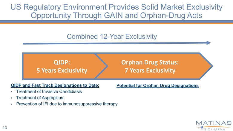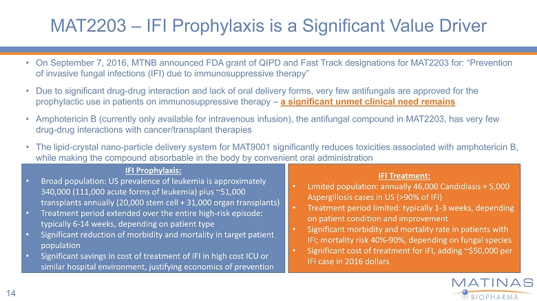 13 Combined 12 - Year Exclusivity QIDP and Fast Track Designations to Date: • Treatment of Invasive Candidiasis • Treatment of Aspergillus • Prevention of IFI due to immunosuppressive therapy Orphan Drug Status: 7 Years Exclusivity QIDP: 5 Years Exclusivity US Regulatory Environment Provides Solid Market Exclusivity Opportunity Through GAIN and Orphan - Drug Acts Potential for Orphan Drug Designations