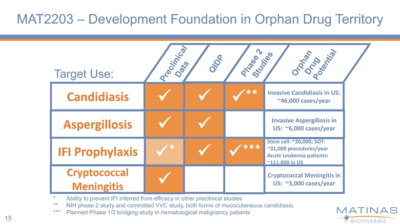 MAT2203 – IFI Prophylaxis is a Significant Value Driver • On September 7, 2016, MTNB announced FDA grant of QIPD and Fast Track designations for MAT2203 for: “Prevention of invasive fungal infections (IFI) due to immunosuppressive therapy” • Due to significant drug - drug interaction and lack of oral delivery forms, very few antifungals are approved for the prophylactic use in patients on immunosuppressive therapy – a significant unmet clinical need remains • Amphotericin B (currently only available for intravenous infusion), the antifungal compound in MAT2203, has very few drug - drug interactions with cancer/transplant therapies • The lipid - crystal nano - particle delivery system for MAT9001 significantly reduces toxicities associated with amphotericin B, while making the compound absorbable in the body by convenient oral administration IFI Prophylaxis: • Broad population: US prevalence of leukemia is approximately 340,000 (111,000 acute forms of leukemia) plus ~51,000 transplants annually (20,000 stem cell + 31,000 organ transplants) • Treatment period extended over the entire high - risk episode: typically 6 - 14 weeks, depending on patient type • Significant reduction of morbidity and mortality in target patient population • Significant savings in cost of treatment of IFI in high cost ICU or similar hospital environment, justifying economics of prevention IFI Treatment: • Limited population: annually 46,000 Candidiasis + 5,000 Aspergillosis cases in US (>90% of IFI) • Treatment period limited: typically 1 - 3 weeks, depending on patient condition and improvement • Significant morbidity and mortality rate in patients with IFI; mortality risk 40% - 90%, depending on fungal species • Significant cost of treatment for IFI, adding ~$50,000 per IFI case in 2016 dollars 14