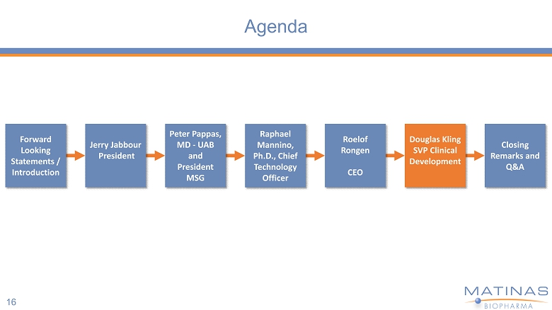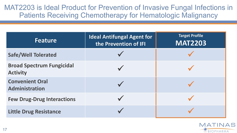 MAT2203 – Development Foundation in Orphan Drug Territory 15 Target Use: Candidiasis Aspergillosis IFI Prophylaxis Cryptococcal Meningitis x x x * x x x x x ** x *** Invasive Candidiasis in US: ~46,000 cases/year Invasive Aspergillosis in US: ~6,000 cases/year Stem cell: ~20,000; SOT: ~31,000 procedures/year Acute Leukemia patients: ~111,000 in US Cryptococcal Meningitis in US: ~3,000 cases/year * Ability to prevent IFI inferred from efficacy in other preclinical studies ** NIH phase 2 study and committed VVC study, both forms of mucocutaneous candidiasis *** Planned Phase 1/2 bridging study in hematological malignancy patients