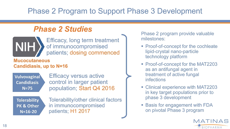 MAT2203 is Ideal Product for Prevention of Invasive Fungal Infections in Patients Receiving Chemotherapy for Hematologic Malignancy 17 Feature Ideal Antifungal Agent for the Prevention of IFI Target Profile MAT2203 Safe/Well Tolerated x x Broad Spectrum Fungicidal Activity x x Convenient Oral Administration x x Few Drug - Drug Interactions x x Little Drug Resistance x x