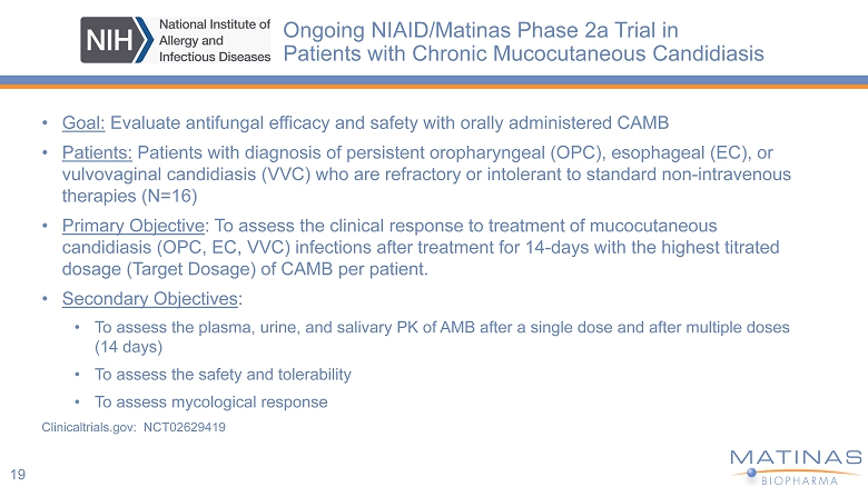 Phase 2 Program to Support Phase 3 Development 18 Phase 2 program provide valuable milestones: ▪ Proof - of - concept for the cochleate lipid - crystal nano - particle technology platform ▪ Proof - of - concept for the MAT2203 as an antifungal agent in treatment of active fungal infections ▪ Clinical experience with MAT2203 in key target populations prior to phase 3 development ▪ Basis for engagement with FDA on pivotal Phase 3 program Mucocutaneous Candidiasis, up to N=16 Phase 2 Studies Efficacy, long term treatment of immunocompromised patients; dosing commenced Vulvovaginal Candidiasis N=75 Tolerability PK & Other N=16 - 20 Efficacy versus active control in larger patient population; Start Q4 2016 Tolerability/other clinical factors in immunocompromised patients; H1 2017
