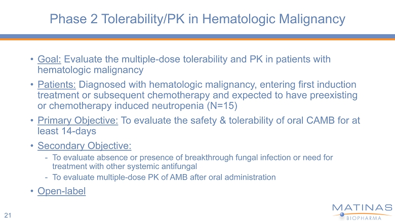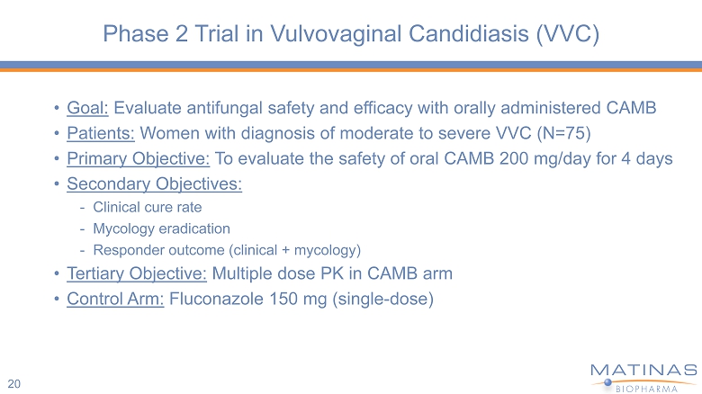 Ongoing NIAID/Matinas Phase 2a Trial in Patients with Chronic Mucocutaneous Candidiasis • Goal: Evaluate antifungal efficacy and safety with orally administered CAMB • Patients: Patients with diagnosis of persistent oropharyngeal (OPC), esophageal (EC), or vulvovaginal candidiasis (VVC) who are refractory or intolerant to standard non - intravenous therapies (N=16) • Primary Objective : To assess the clinical response to treatment of mucocutaneous candidiasis (OPC, EC, VVC) infections after treatment for 14 - days with the highest titrated dosage (Target Dosage) of CAMB per patient. • Secondary Objectives : • To assess the plasma, urine, and salivary PK of AMB after a single dose and after multiple doses (14 days) • To assess the safety and tolerability • To assess mycological response Clinicaltrials.gov: NCT02629419 19