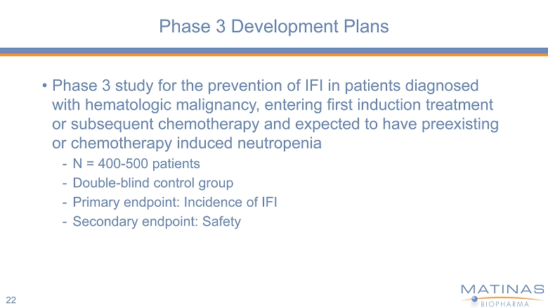 Phase 2 Tolerability/PK in Hematologic Malignancy • Goal: Evaluate the multiple - dose tolerability and PK in patients with hematologic malignancy • Patients: Diagnosed with hematologic malignancy, entering first induction treatment or subsequent chemotherapy and expected to have preexisting or chemotherapy induced neutropenia (N=15) • Primary Objective: To evaluate the safety & tolerability of oral CAMB for at least 14 - days • Secondary Objective: - To evaluate absence or presence of breakthrough fungal infection or need for treatment with other systemic antifungal - To evaluate multiple - dose PK of AMB after oral administration • Open - label 21