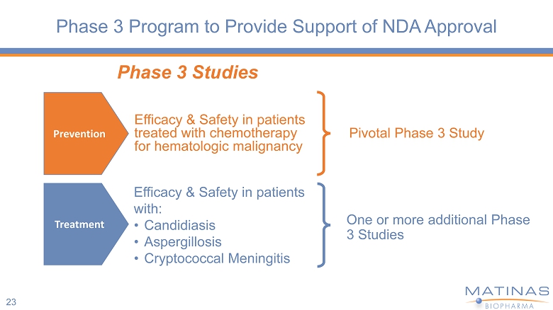 Phase 3 Development Plans • Phase 3 study for the prevention of IFI in patients diagnosed with hematologic malignancy, entering first induction treatment or subsequent chemotherapy and expected to have preexisting or chemotherapy induced neutropenia - N = 400 - 500 patients - Double - blind control group - Primary endpoint: Incidence of IFI - Secondary endpoint: Safety 22