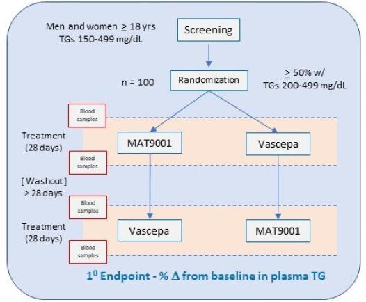 Triglycerides (TGs) and cholesterol are integral components of lipoproteins, the primary transport vehicle for lipids in the body. High levels of triglyceride-rich lipoproteins are associated with a substantially increased risk of atherosclerotic cardiovascular disease, and, in the case of very high triglycerides, acute pancreatitis. Triglyceride elevations can be due to both genetic and environmental factors and are frequently associated with comorbid conditions such as diabetes, chronic renal failure, and nephrotic syndrome. Unlike the currently approved pharmaceutical omega-3 products, all of which have been repurposed following clinical failures in their originally intended indications, MAT9001 has been specifically designed and developed to treat SHTG, dyslipidemia and other cardiovascular and metabolic conditions.