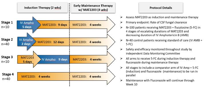 In partnership with the NIH, we have conducted numerous preclinical studies of MAT2203 in cryptococcal meningitis, and demonstrated that MAT2203 was able to (a) cross the blood-brain barrier, (b) effectively treat this infection and (c) eliminate the toxicity normally associated with delivery of amphotericin B intravenously. The NIH has funded a grant submission from the University of Minnesota for a clinical study of MAT2203 in patients with cryptococcal meningitis in Uganda, where this disease is very prevalent among the human immunodeficiency virus (HIV)-positive community. This study, which has been called the Encochleated Oral Amphotericin for Cryptococcal Meningitis Trial (EnACT), initiated in 2019, is exploring the use of MAT2203 for both induction and maintenance therapy, and we believe that, if positive, it could form the foundation for registrational approval in this indication. Moreover, since this study potentially validates the use of MAT2203 in what is arguably one of the most difficult-to-treat fungal infections, we believe MAT2203 is well positioned to become a best-in-class antifungal drug for the treatment of invasive fungal infections. Furthermore, a demonstration that MAT2203 can effectively cross the blood-brain barrier in humans could potentially position our LNC platform delivery technology for use with molecules designed to treat other inflammatory diseases of the central nervous system. Developing MAT2203 utilizing primarily non-dilutive, government-sponsored, financing allows us to focus our internal cash resources on MAT9001 while advancing MAT2203 and our innovative LNC platform delivery technology.