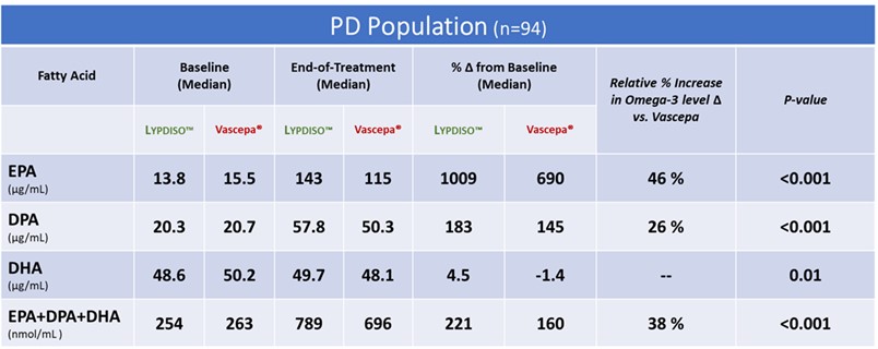 Blood fatty acids levels increased with both LYPDISO™ and Vascepa®, with similar findings in both the PD and the PP populations. In the PD population the change in fatty acid level with LYPDISO™ was 46% greater for EPA, 26% greater for DPA, and 38% greater for total omega-3 levels than with Vascepa® – all highly statistically significant. DHA levels did not change meaningfully with either therapy but increased slightly with LYPDISO™.
