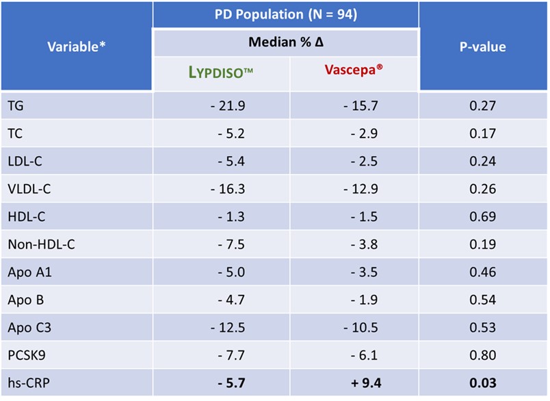 In the PD population there was a greater reduction in TGs with LYPDISO™ (21.9%) as compared with Vascepa (15.7%); this 39% relative improvement did not achieve statistical significance. In the PP population, there were statistically significant superior reductions in TGs, total cholesterol (TC), VLDL cholesterol (VLDL-C) and high sensitivity C-reactive protein (hsCRP), a well-established inflammatory marker.