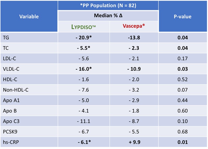 In the PP population, LYPDISO™ reduced TGs by 20.9%, compared to a 13.8% reduction with Vascepa®; this difference was significant with a P-value of 0.04 (a relative improvement of 51%).