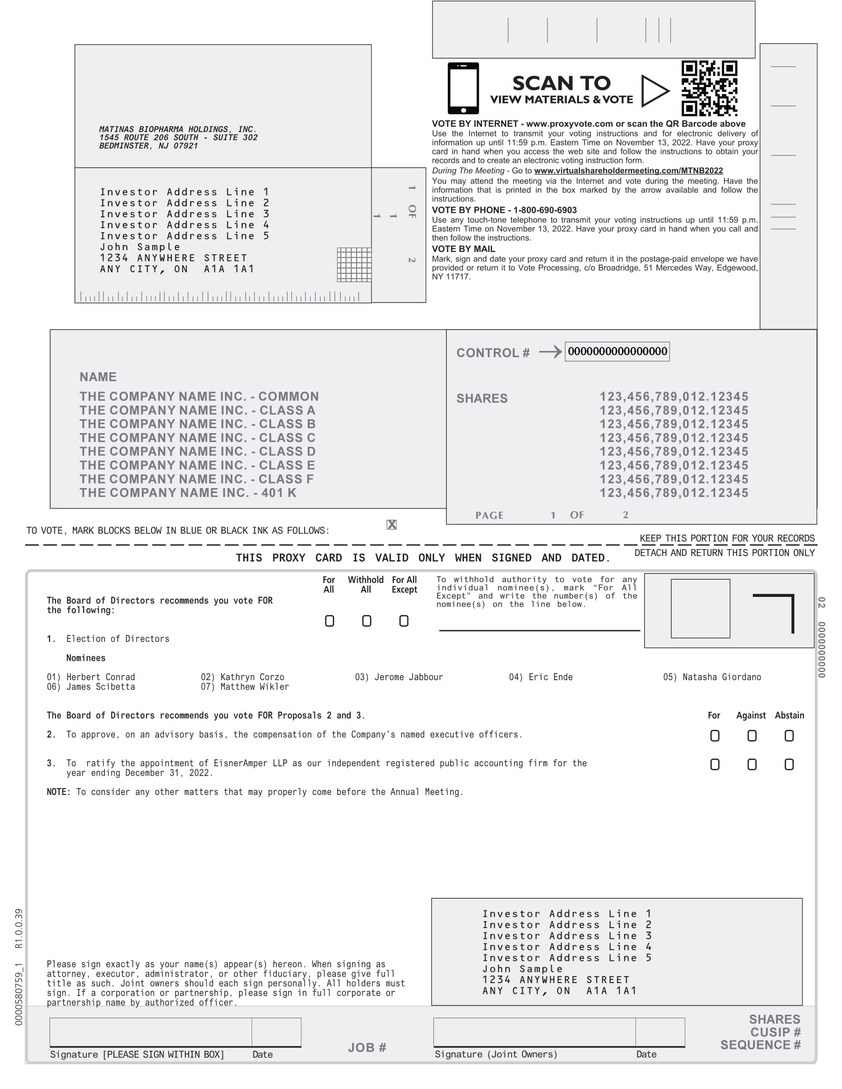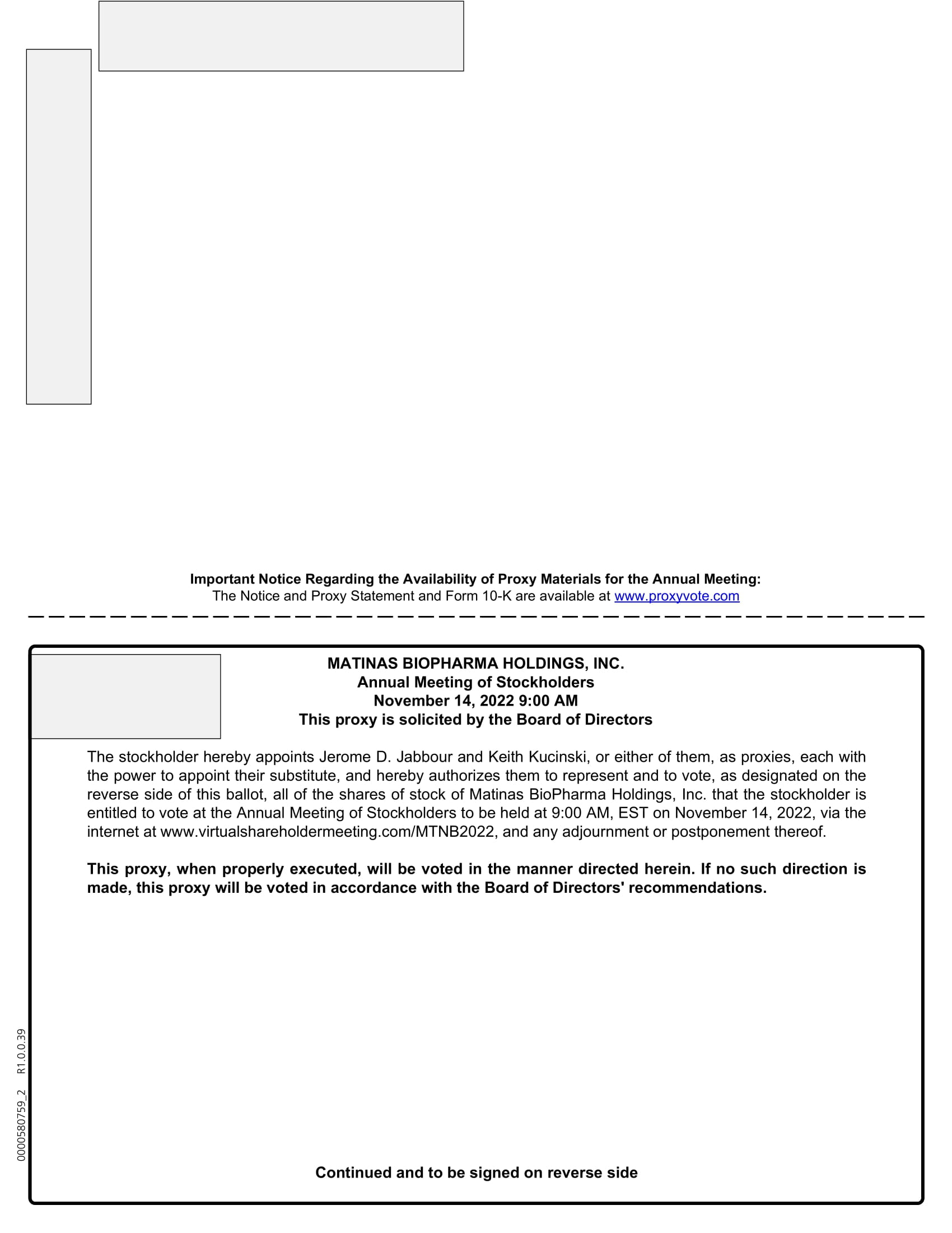 NOTICE IS HEREBY GIVEN that the Annual Meeting of Stockholders of Matinas BioPharma Holdings, Inc. (the “Company”) will be held via the internet on November 14, 2022, beginning at 9 a.m. local time. Shareholders will be able to listen, vote and ask questions regardless of location via the internet at www.virtualshareholdermeeting.com/MTNB2022 by using the control number included on your notice regarding the availability of proxy materials, proxy card (printed in the box and marked by the arrow) and the instructions that accompanied your proxy materials. You will not be able to attend the Annual Meeting in person. At the Annual Meeting, stockholders will act on the following matters: