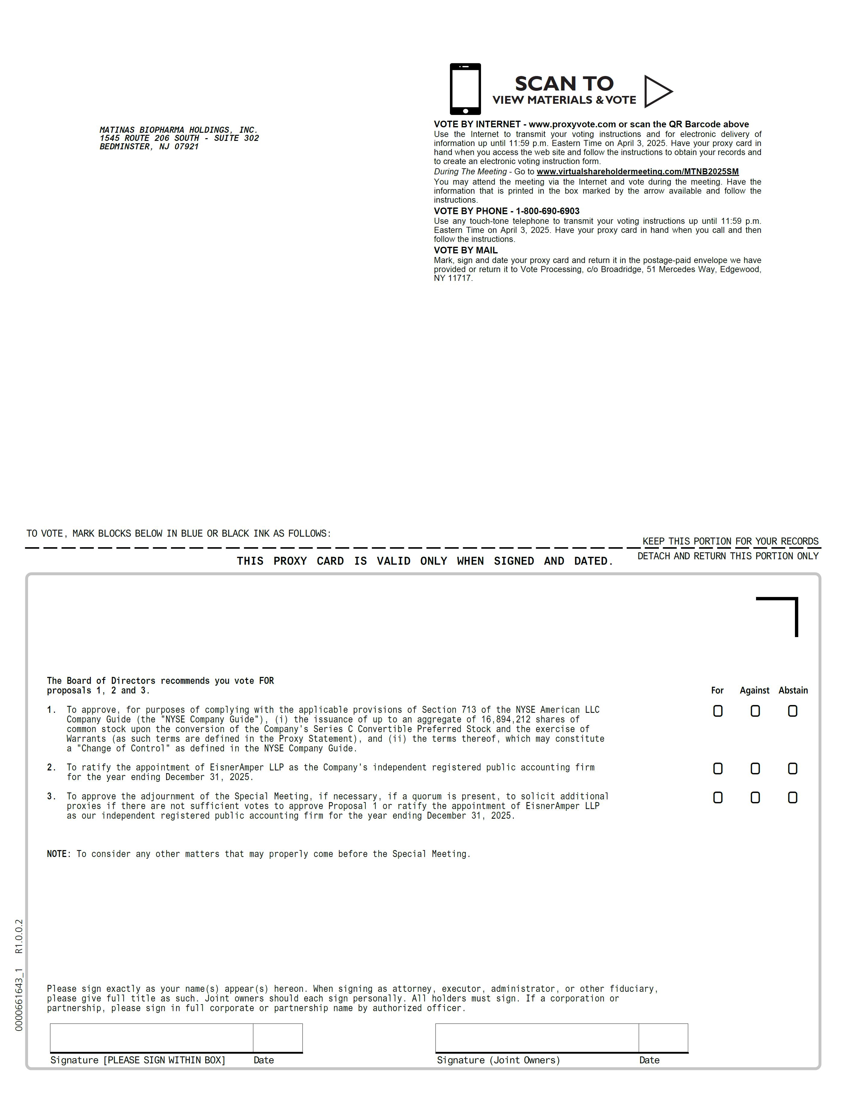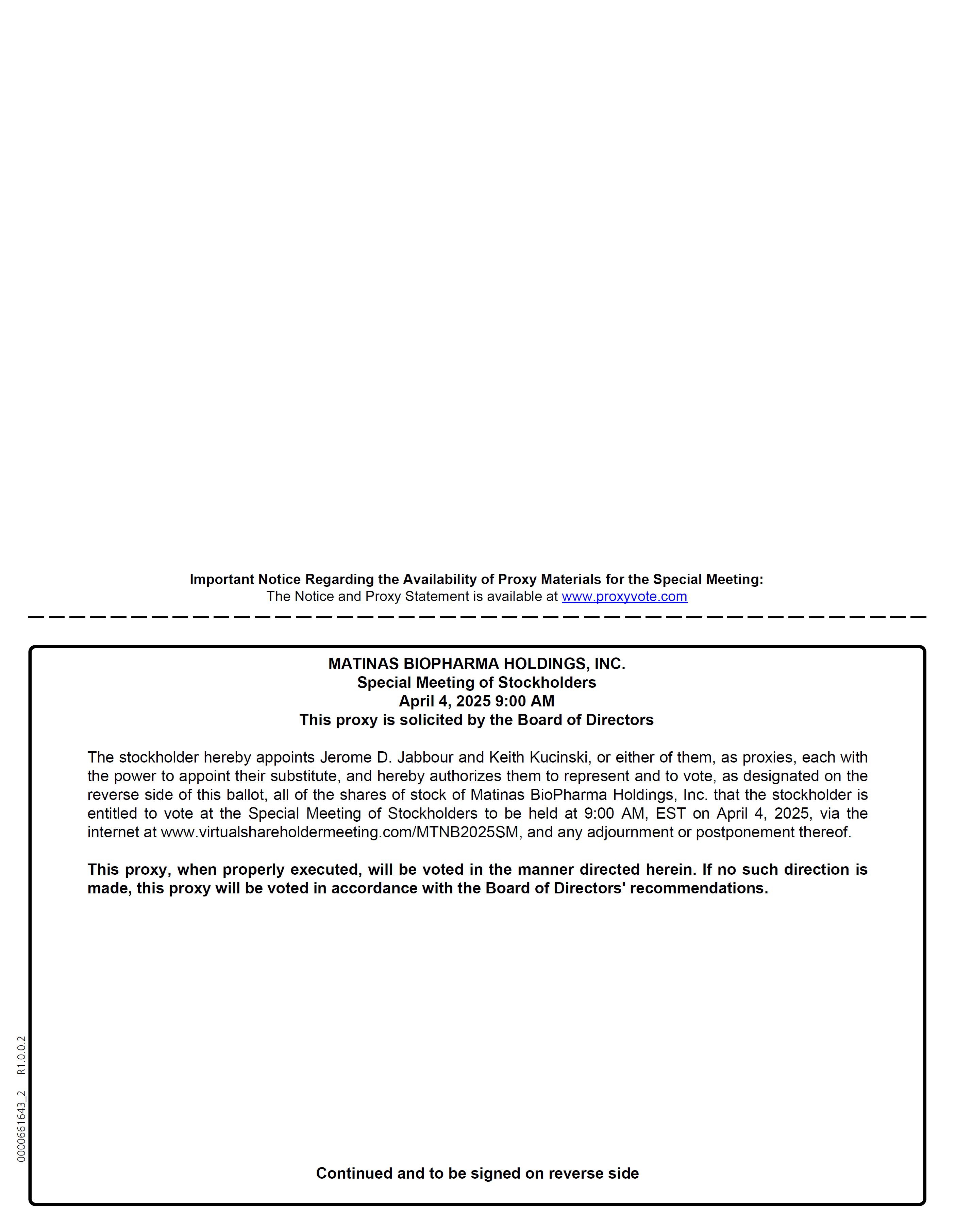 NOTICE IS HEREBY GIVEN that a Special Meeting of Stockholders of Matinas BioPharma Holdings, Inc. (the “Company”) will be held on April 4, 2025, beginning at 9 a.m. local time via the internet. Stockholders will be able to listen, vote and ask questions regardless of location via the Internet at www.virtualshareholdermeeting.com/MTNB2025SM by using the control number included on your notice regarding the availability of proxy materials, proxy card (printed in the box and marked by the arrow) and the instructions that accompanied your proxy materials. You will not be able to attend the Special Meeting in person. At the Special Meeting, stockholders will act on the following matters: