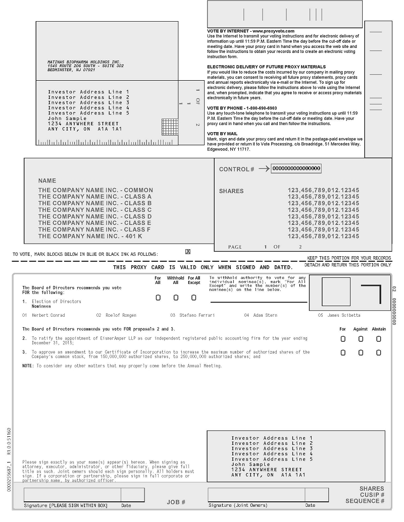 Our proxy materials including our Proxy Statement for the 2015 Annual Meeting, our Annual report for the fiscal year ended December 31, 2014 and proxy card are available on the Internet at http://ir.matinasbiopharma.com/proxy-materials. Under Securities and Exchange Commission rules, we are providing access to our proxy materials both by sending you this full set of proxy materials, and by notifying you of the availability of our proxy materials on the Internet.