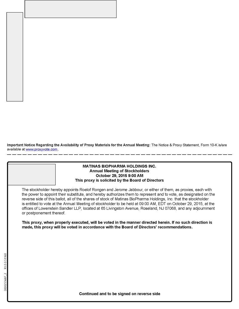 Copies of our Annual Report on Form 10-K (including audited financial statements), as amended, filed with the SEC may be obtained without charge by writing to Matinas BioPharma Holdings, Inc., 1545 Route 206 South, Suite 302, Bedminster, New Jersey 07921, Attn.: Corporate Secretary. A request for a copy of our Annual Report on Form 10-K must set forth a good-faith representation that the requesting party was either a holder of record or a beneficial owner of our common stock on September 8, 2015. Exhibits to the Form 10-K will be mailed upon similar request and payment of specified fees to cover the costs of copying and mailing such materials.