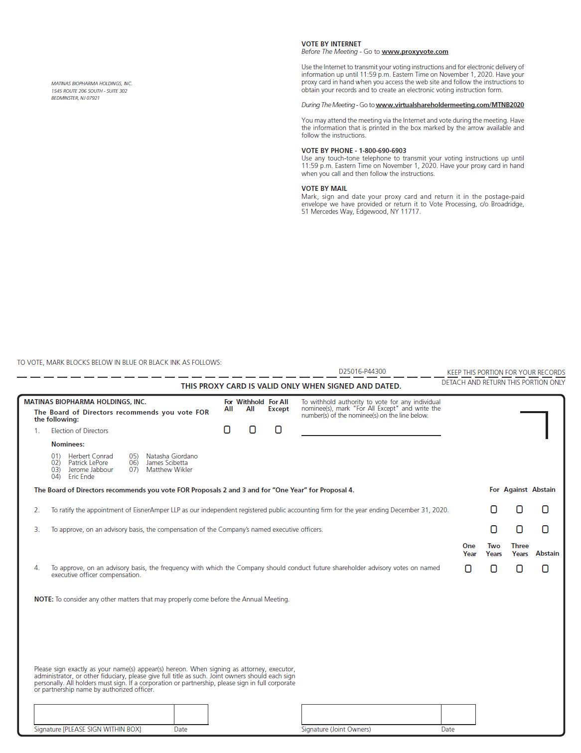 This proxy statement contains information related to the Annual Meeting of Stockholders to be held on November 2, 2020 at 9 a.m. local time via the internet at www.virtualshareholdermeeting.com/MTNB2020, or at such other time and place to which the Annual Meeting may be adjourned or postponed. The enclosed proxy is solicited by the Board of Directors of Matinas BioPharma Holdings, Inc. (the “Board”). The proxy materials relating to the Annual Meeting are being mailed to stockholders entitled to vote at the meeting on or about October 1, 2020.