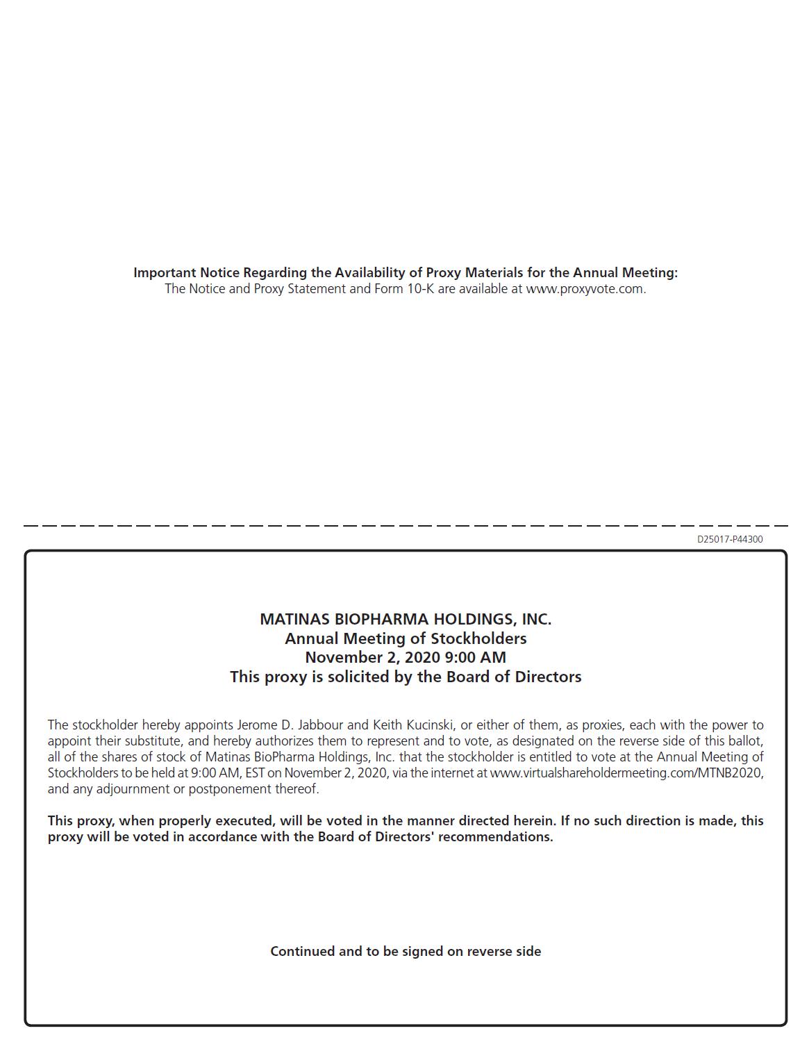 Copies of our Annual Report on Form 10-K (including audited financial statements) filed with the SEC may be obtained without charge by writing to Matinas BioPharma Holdings, Inc., 1545 Route 206 South, Suite 302, Bedminster, New Jersey 07921, Attn.: Corporate Secretary. A request for a copy of our Annual Report on Form 10-K must set forth a good-faith representation that the requesting party was either a holder of record or a beneficial owner of our common stock on September 16, 2020. Exhibits to the Form 10-K will be mailed upon similar request and payment of specified fees to cover the costs of copying and mailing such materials.
